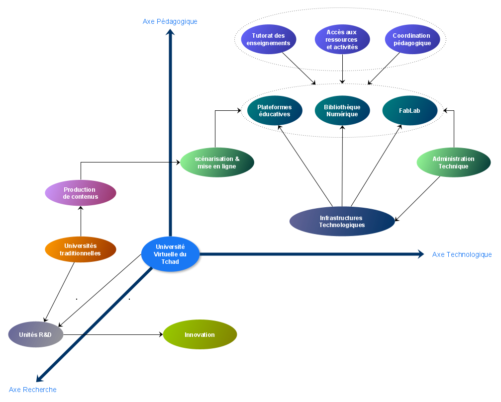 Dans le sillage de l'essor du numérique et dans une quête perpétuelle d'efficacité, des approches éducatives innovantes, basées sur les technologies numériques, sont proposées afin de rendre l'éducation plus flexible, plus performante, plus foisonnante et plus ouverte. La création de l'Université Numérique du Tchad s'inscrit donc dans cette dynamique techno-pédagogique portée par la révolution numérique et l'expansion de l'Internet, d'une part, et la poursuite de modernisation du paradigme éducatif tchadien, d'autre part. L'Université Numérique du Tchad vise ainsi à moderniser les méthodes pédagogiques obsolescentes et proposer des offres de formation initiale et continue en ligne pour faire face aux divers impératifs éducatifs.