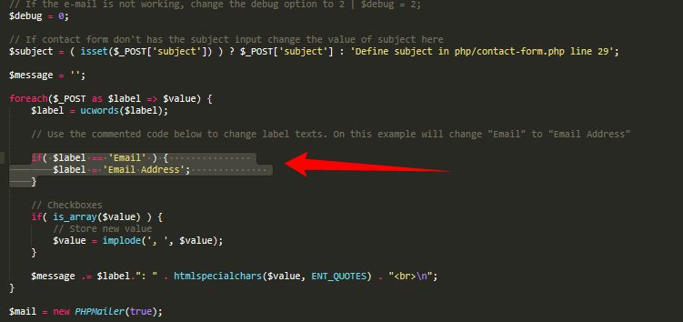4.1) OPTIONAL: You can easily change the label text of each field. For example, to change "Email" for "Email Address" just uncomment the code like on image below: