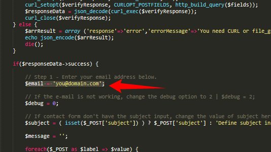 9) In php/contact-form-recaptcha-v3.php change the value of variable $email to your email (the email that will receive contacts)